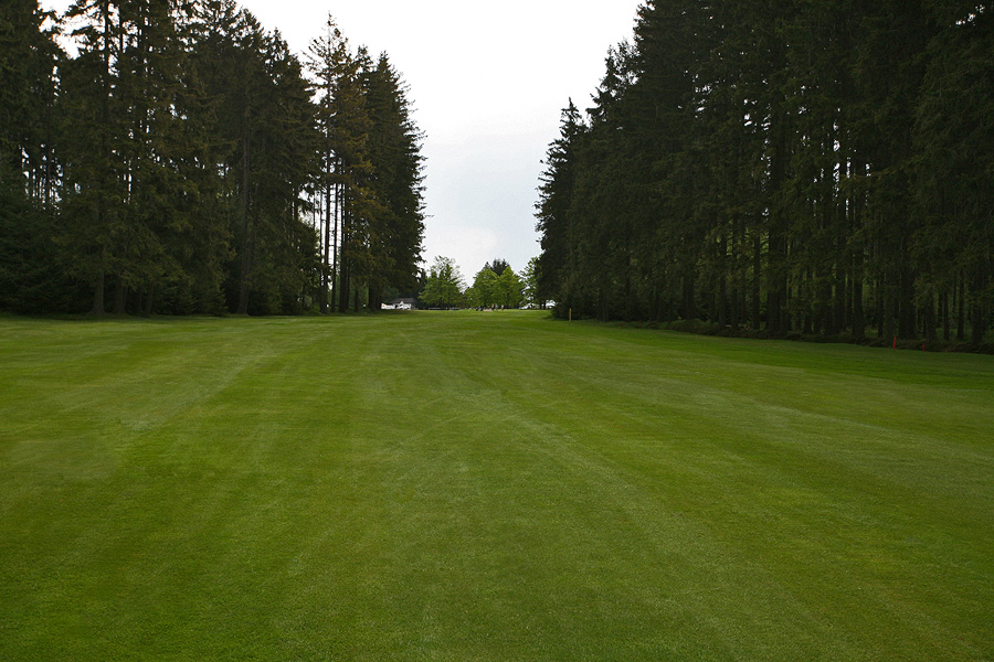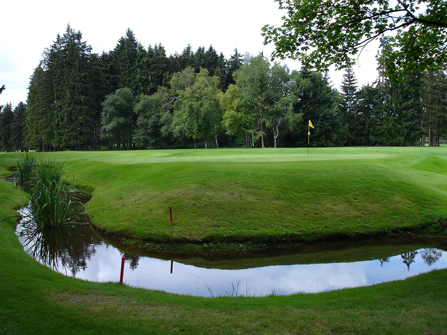 Neumožňuje nám to hrát z odpaliště dřevo, protože jamka je z obou stan lemována lesem a průchod je velmi úzký. Kolem dvanácti, patnácti metrů. Doporučuji trojku, pětku dřevo nebo dlouhé železo. Já osobně jsem si stanovil na této jamce par 5 a tu jamku tak hraji. To znamená první ránu ještě do široké části fairwaye, kolem sto devadesáti metrů. Na druhou ránu vezměte v každém případě opět železo. Na pravé straně fairwaye je překážka, která končí asi na dvou stech metrech. Před greenem vlevo je bunker, na který navazuje travnatý příkop. Rozhodně hrajte druhou ránu kolem sto padesáti metrů, aby vám zbývalo padesát metrů do greenu. Minout ho vpravo znamená nebezpečí vodní překážky. Pokud riskujete druhou ránu na green, hrajte raději vlevo. Green je úzký a ve směru hry má poměrně silnou terénní vlnu. Počítejte s tím, že je velmi rychlý. Rozhodně se příhrou, ať už je to třetí nebo čtvrtá rána, snažte skončit pod jamkou.