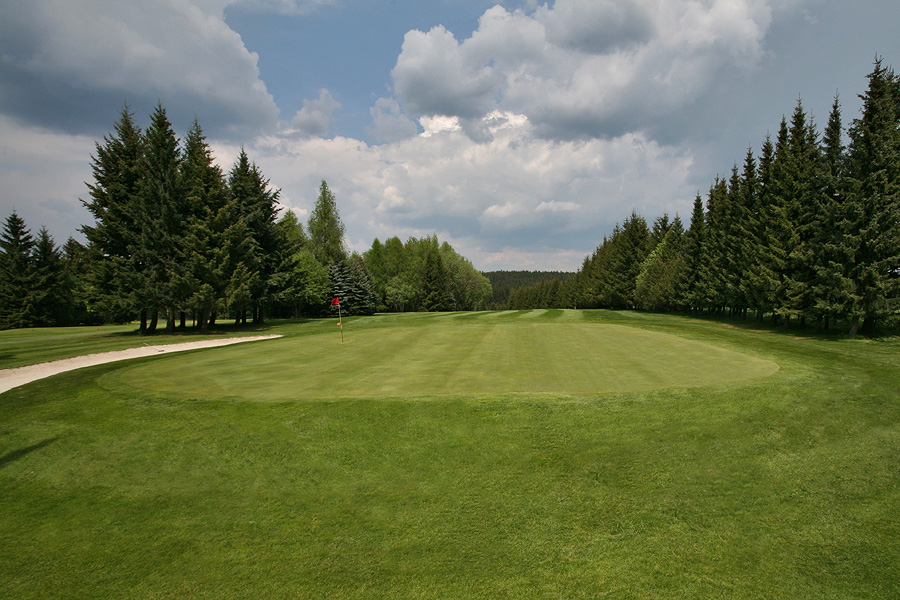 Z levé strany je lemována hranicemi hřiště. Dopadová zóna je velmi úzká, asi dvacet metrů. Proto je třeba zahrát jamku takticky. Na pravé straně je opět lesní remízek. Neriskujte! Zahrajte ránu kolem sto sedmdesáti metrů. Druhá rána kolem sto šedesáti metrů vám potom umožní poměrně slušně trefit green. Ten je po pravé straně chráněn bunkrerem. Za ním je terénní vlna. Tato jamka neskrývá žádné záludnosti před greenem, takže i hra dlouhým železem nemusí končit přímo na něm. Můžeme nechat balónek třicet metrů rolovat. Za takticky správné považuji odehrát z odpaliště železem.