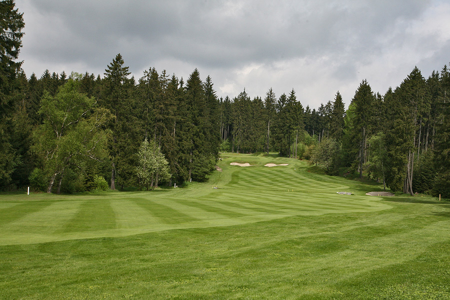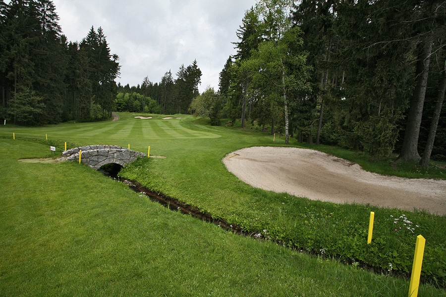 Jedna z nejhezčích jamek v Mariánských Lázních. Dogleg doleva, opět velmi technická jamka.