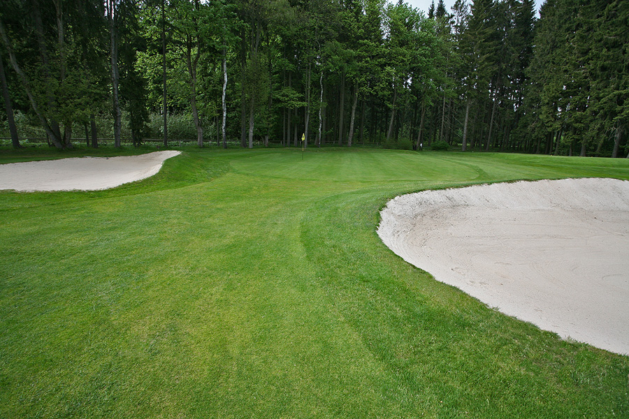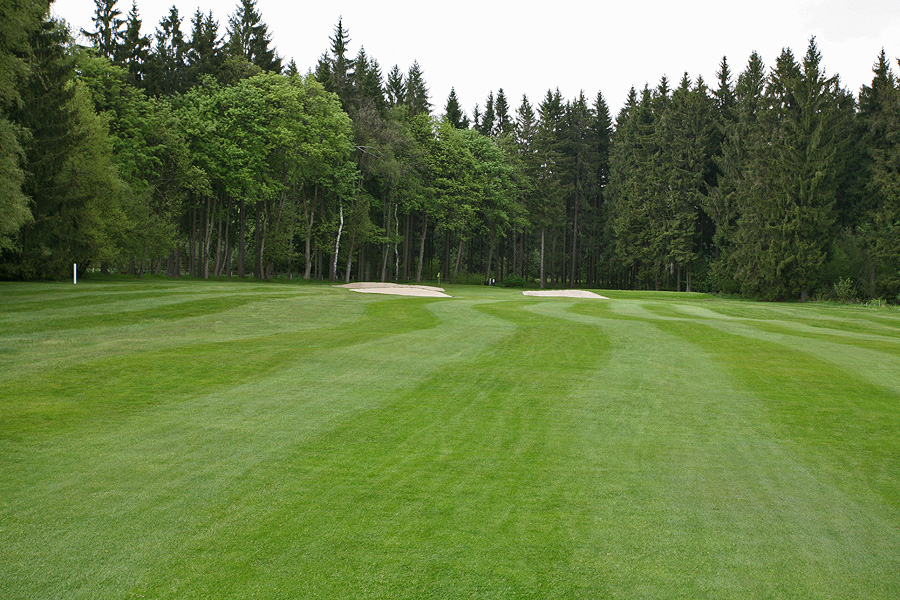 Za greenem vlevo dávejte pozor na hranice hřiště. Pokud mineme green, pravá strana je tou stranou, odkud je příhra snazší. Na jamce není žádná záludnost, měl bych se pokusit i za cenu, že vezmu pětku dřevo dohrát na green. Ten, až na malou terénní vlnu na jeho začátku, neskýtá žádný problém.